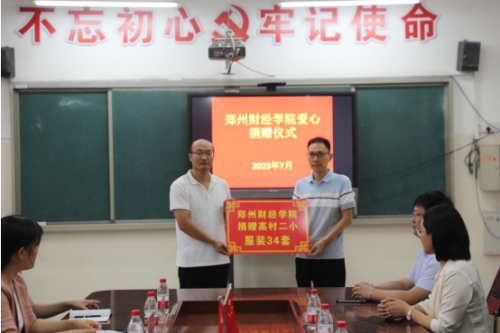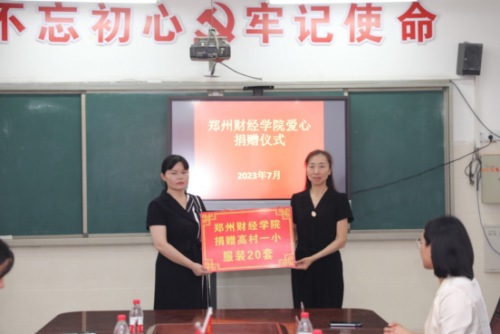隨后,鄭州財經學院團委書記周二濤、校工會副主席袁清分別向高村鄉一小、二小校長捐贈物資。高村鄉副鄉長楊靜向鄭州財經學院外國語學院黨總支書記閆靜授予捐贈贈書。