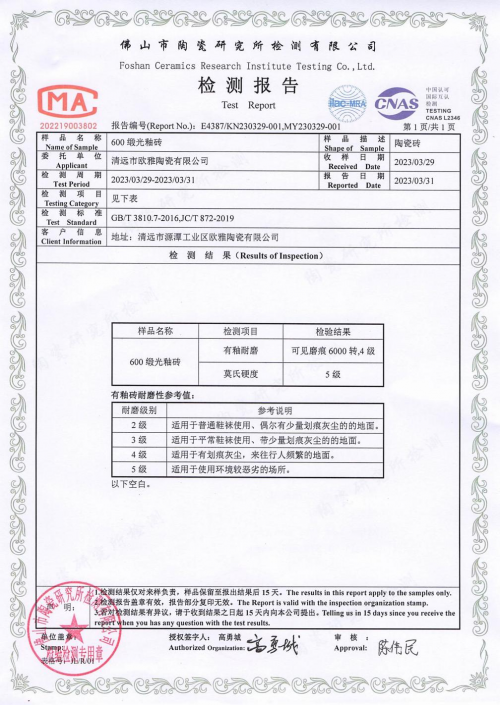 歐美親膚質(zhì)感磚采用最新研發(fā)的2.0肌膚釉料,結(jié)合多重技術(shù)工藝,不但顏值出眾,耐磨性能更是表現(xiàn)優(yōu)秀,經(jīng)權(quán)威專業(yè)機構(gòu)測試,其莫氏硬度可達(dá)5級以上,耐磨度高達(dá)6000轉(zhuǎn),工藝技術(shù)水平遠(yuǎn)超行業(yè)標(biāo)準(zhǔn)!