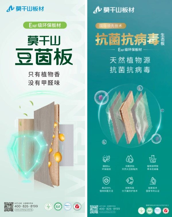 不僅是新品有顏值更實力,其實早在2016年,莫干山板材就在業內首創了實木芯清醛除菌板、負離子金剛面等一系列功能性產品,至今依舊保持著強有力的升級動力,包括當下板材類產品粘合劑中使用植物豆膠,目的就是要打造更健康、更環保的產品。