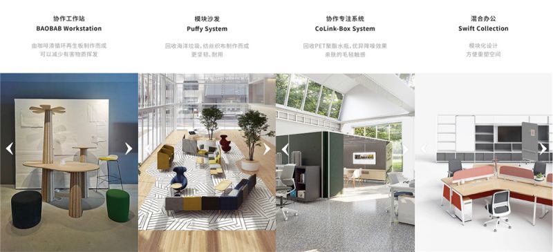 震旦創新中心運用3R原則融入辦公家具設計之中:例如以由咖啡渣循環再生板制作而成BAOBAB Workstation 協作工作站,減少有害物質揮發;Puffy System模塊沙發由回收海洋垃圾紡絲織布制作而成,使得面料更加堅韌、耐用;CoLink-Box System專注協作系統材料為PET聚酯水瓶回收,擁有優異降噪效果,親膚的毛氈觸感,成為辦公場景切換專注私密和團隊協作的靈動空間;Swift Collection混合辦公支持模塊化設計,更適應數字化企業,方便重塑空間。