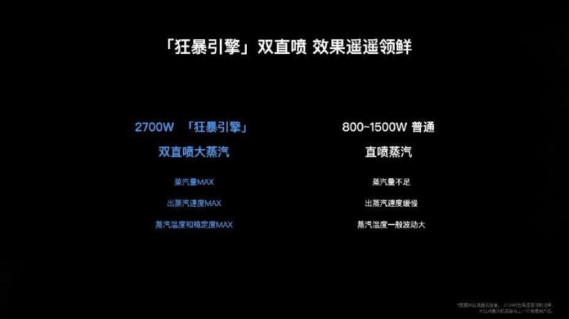 2700W狂暴引擎雙直噴出道即標(biāo)桿,澎湃蒸汽迅猛疾噴,快速鎖住食材營(yíng)養(yǎng),保留鮮嫩口感。獨(dú)立直噴系統(tǒng),徹底告別落后煮水式蒸發(fā)器帶來的食物串味、清潔打理不便等問題,大大提升用戶體驗(yàn)。