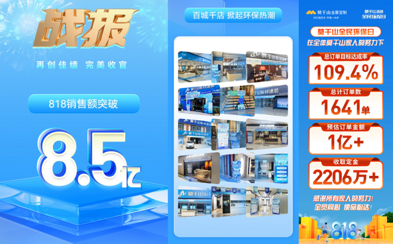 “818全民環保日”是云峰莫干山為更好滿足國人家裝新需求,推出的品牌獨創營銷IP活動,以家裝的綠色環保升級為出發點,通過線上+線下雙渠道覆蓋傳播,用ENF級環保產品回饋消費者,推進全民ENF級普及,讓環保家裝惠及每一位消費者。第二屆“818全民環保日”繼承首屆環保基因,提出“環保本該如此”主題,聯動全國數千家門店,板材、全屋定制、地板三大品類齊上線,超低折扣、買贈有禮、定金膨脹等一系列超值優惠掀起搶購熱潮,終端門店家家爆滿,萬元訂單接不停!“818全民環保日”不僅是一場全民狂歡盛宴,也是云峰莫干山成功推廣更健康更環保家裝理念的見證。