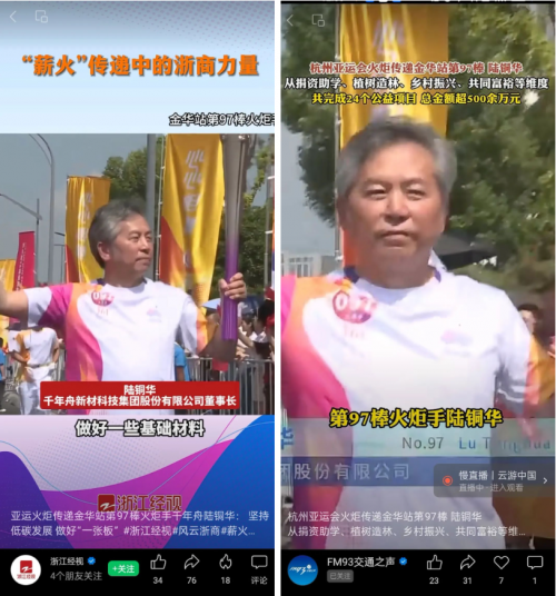 此次千年舟集團董事長陸銅華擔任亞運會火炬手,不僅得到了廣大民眾的歡呼和鼓勵,更得到了浙江多個主流媒體的轉載與采訪,包括由浙江省人民政府新聞辦公室推出,浙江廣電集團運營的“美麗浙江”、浙江經視、FM93交通之聲、定峰匯等新媒體賬號第一時間進行了跟進報導,權威力量的發聲再一次奠定了千年舟集團巨大的品牌影響力。