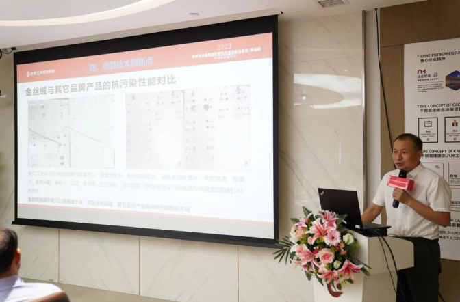金牌企業副總裁湯浩首先在鑒定會上向鑒定專家團成員的到來表示熱烈的歡迎,并對此次金絲絨超抗污的工藝技術接受鑒定充滿信心。