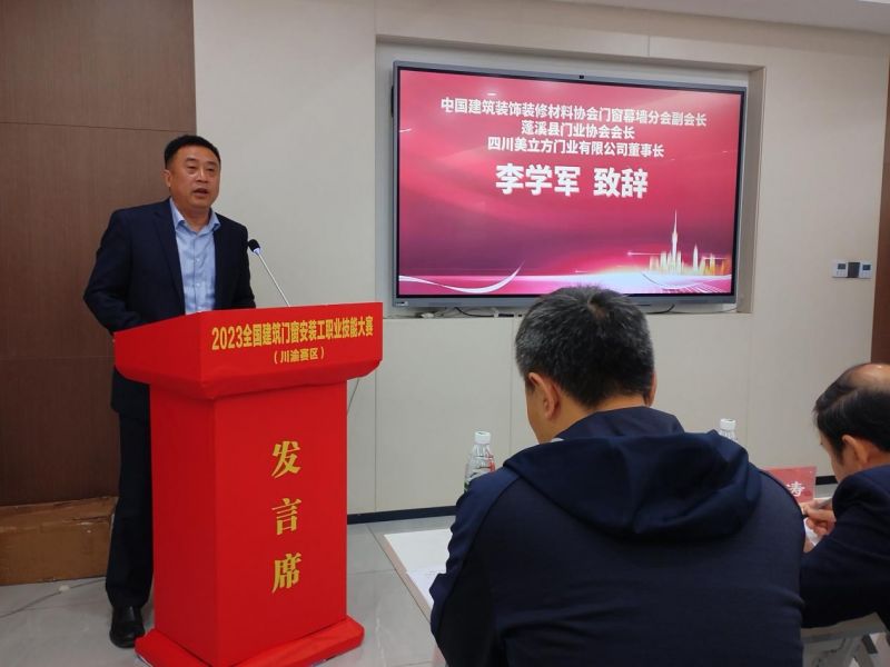 隨后,分會(huì)副會(huì)長、蓬溪縣門業(yè)協(xié)會(huì)會(huì)長、四川美立方門業(yè)有限公司董事長李學(xué)軍先生,熱烈歡迎來自川渝賽區(qū)的安裝工師傅們參與本次大賽,并向一直以來默默耕耘在門窗行業(yè),兢兢業(yè)業(yè)助推行業(yè)高質(zhì)量發(fā)展的工作者們表示由衷的感謝!在過去的十年里,“蓬溪門”在產(chǎn)業(yè)轉(zhuǎn)型中迅速崛起,成為全國唯一的縣級(jí)門業(yè)產(chǎn)業(yè)集群。本次舉辦職業(yè)技能大賽和職業(yè)人才評(píng)選表彰是激勵(lì)我們門窗行業(yè)廣大技術(shù)勞動(dòng)者們努力鉆研技術(shù)業(yè)務(wù),提供勞動(dòng)者整體素質(zhì)的重要策略,對(duì)樹立現(xiàn)代化科學(xué)的人才觀,提高技術(shù)工作者的社會(huì)地位,形成全社會(huì)尊重技能、尊重技術(shù)人才的社會(huì)氛圍具有重要意義和作用。本次大賽始終秉持著“公平、公正、交流、選才”的宗旨,搭建門窗安裝交流平臺(tái),讓門窗行業(yè)安裝工精英們匯聚一堂,切磋技能,交換建筑門窗安裝心得,共同營造積極向上,相互學(xué)習(xí)的門窗技術(shù)安裝環(huán)境;竭誠營造尊重技能、崇尚技能的行業(yè)氛圍。在接下來的比賽中,愿大家賽出友誼,賽出水平,從而更大力度的推動(dòng)門窗行業(yè)企業(yè)高質(zhì)量飛速發(fā)展。
