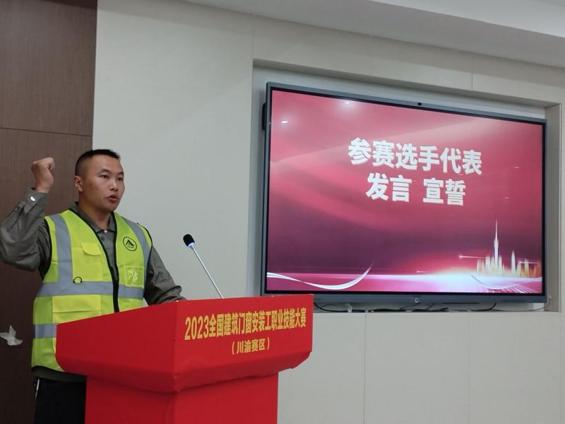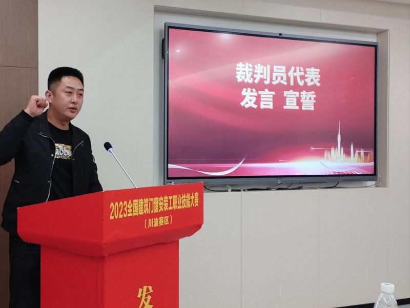 裁判員代表發(fā)表了評(píng)審專家(裁判員)宣言,將全心全意地為本次比賽做好評(píng)審工作,在此評(píng)審中將嚴(yán)守公開、公平、公正的原則,遵照評(píng)分細(xì)則,嚴(yán)肅認(rèn)真、高度負(fù)責(zé)地完成好評(píng)委職責(zé),并自愿接受大家的監(jiān)督,全體評(píng)委尊重每位參賽選手,文明評(píng)審,秉公辦事,圓滿完成本次建筑門窗安裝工職業(yè)技能大賽川渝賽區(qū)的評(píng)審任務(wù)。