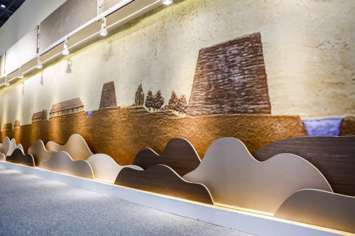 以木為基,以舟為始,從良渚先民打造獨木舟穿梭于內(nèi)外城探索更廣闊的世界,到千年舟從世紀(jì)之交駕舟啟航,5000年文化積淀,造就了千年舟獨特的文化審美與精神傳承。以新石器時代人類文明“玉器、狩獵、農(nóng)耕、編織、圖騰”為靈感打造的全新花色鋪陳,刻畫出的一整個背景墻的歷史長圖,波瀾起伏間完整再現(xiàn)了千年前真實、立體、全面的中華文明圣地。