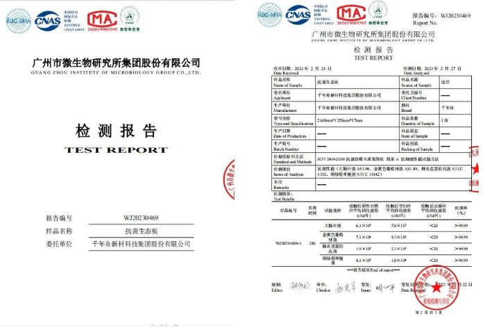 經(jīng)第三方權(quán)威檢測,針對菌種:黑曲霉(AS3.4463)丶土曲霉(AS3.3935)丶宛氏擬青霉(AS3.4253)丶繩狀青霉(AS3.3875)丶出芽短梗霉(AS3.3984)丶球毛殼霉(AS3.4254),鋅效抗菌2.0生態(tài)板均達(dá)到最高防霉等級0級防霉。