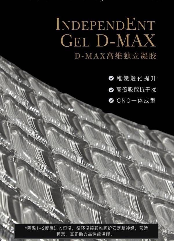 頂層的D-MAX高維獨立酥軟凝膠,不僅讓感官豐盈飽滿,更是奢華睡眠的專屬。凝膠科技材質清涼恒溫助眠,不僅承托更加自然,舒適感也再次加倍。。