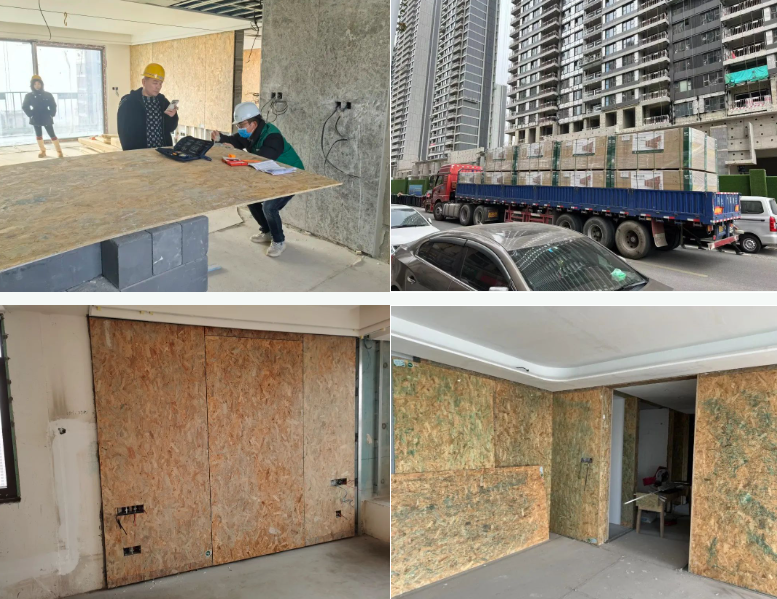 在施工現(xiàn)場(chǎng),千年舟難燃OSB板全部鋪裝完成,現(xiàn)場(chǎng)可以看到整個(gè)墻體鋪裝整齊,產(chǎn)品表面刨片分布均勻,縱橫交錯(cuò),同時(shí)在電梯、窗框、門頭均有千年舟產(chǎn)品鋪裝;千年舟抽檢服務(wù)人員同項(xiàng)目負(fù)責(zé)人一起在現(xiàn)場(chǎng)對(duì)倉庫和施工場(chǎng)地的千年舟板材產(chǎn)品進(jìn)行了全方位檢測(cè),針對(duì)施工現(xiàn)場(chǎng)和倉庫儲(chǔ)存進(jìn)行了常規(guī)的注意事項(xiàng)科普;項(xiàng)目施工方對(duì)千年舟的服務(wù)和產(chǎn)品質(zhì)量給予高度評(píng)價(jià),彰顯了千年舟作為一個(gè)負(fù)責(zé)任的企業(yè)對(duì)于產(chǎn)品和服務(wù)的苛刻追求