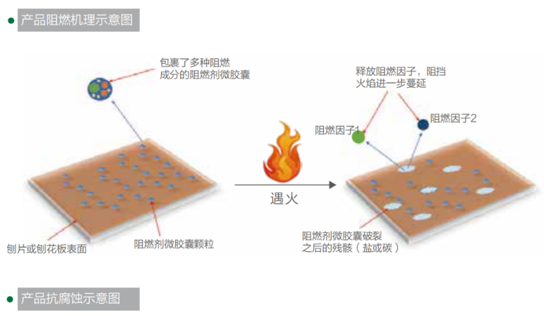 板材受熱時(shí),刨片表面的微膠囊破裂,吸收熱量,同時(shí)釋放的高效阻燃因子能稀釋燃燒區(qū)域的可燃物濃度,有效抑制火焰蔓延。微膠囊破裂后,碳化、鹽化的產(chǎn)物覆蓋在刨片表面,阻止煙氣逸出,實(shí)現(xiàn)阻燃抑煙的雙重效果。