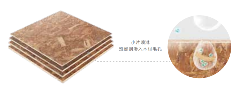 微膠囊包覆技術(shù)有效加強(qiáng)阻燃劑與刨片的界面相容性,從而提高了阻燃劑在刨片表面的接枝率,在潮濕環(huán)境下阻燃劑不會(huì)析出,增強(qiáng)阻燃劑的抗流失性。(經(jīng)千年舟實(shí)驗(yàn)室檢測(cè),難燃OSB板在25℃溫度、85%濕度的潮濕環(huán)境下放置28天無阻燃劑析出)