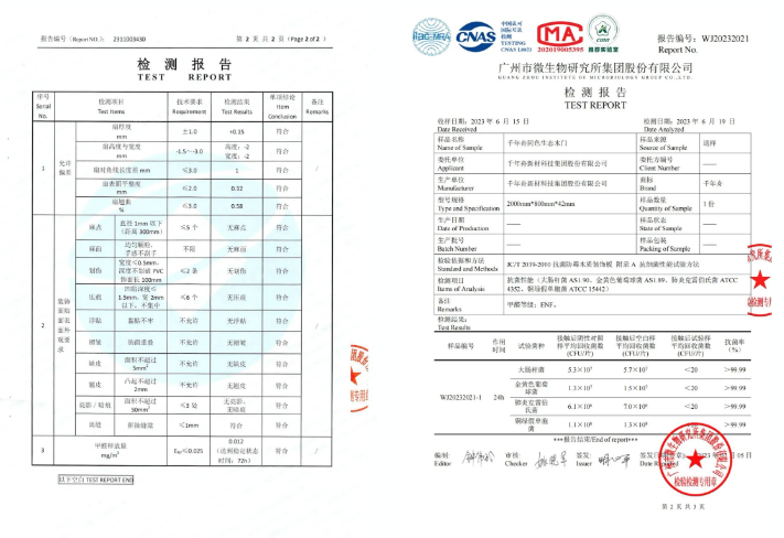 根據廣州市微生物研究所集團股份有限公司檢測結果(報告編號WJ20232021),應用自主研發的鋅效抗菌技術手段的千年舟木門飾面,針對大腸桿菌、金黃色葡萄球菌、銅綠假單胞菌、肺炎克雷伯氏菌等菌種,具備高達99.9%以上的抗菌效果。