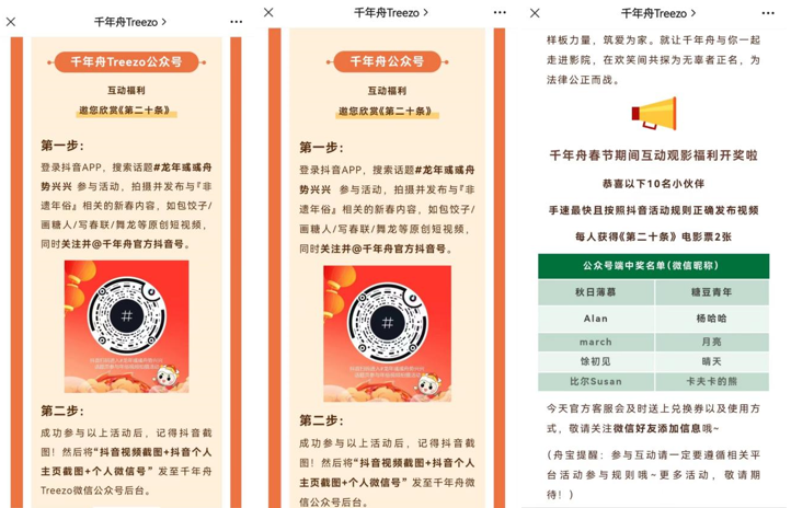 活動期間,千年舟官方抖音號每天兩場直播,共持續15天,場場均有贈票活動,成功吸引更多用戶的目光;此外,用戶登錄抖音APP,搜索話題#龍年彧彧舟勢興興 參與千年舟官方活動,就有機會獲得《第二十條》電影票,成功實現多平臺聯動。