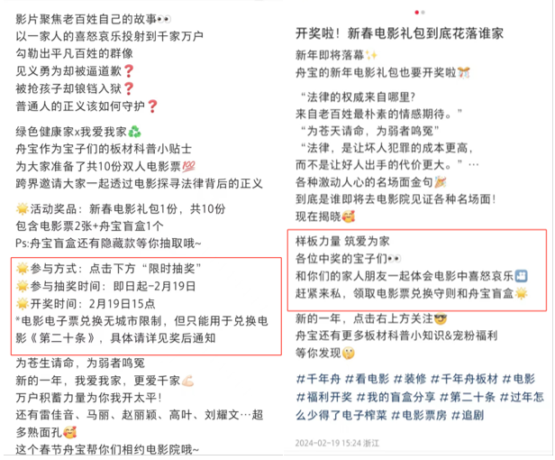 作為電影《第二十條》聯合推廣伙伴,有了前一年的經驗,千年舟在電影營銷上駕輕就熟,活動期間便開啟線上直播和多平臺宣傳,形成品牌傳播矩陣,線上線下齊發力,實現品牌與用戶雙向奔赴。
