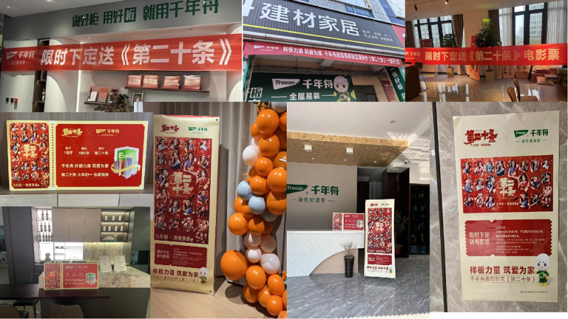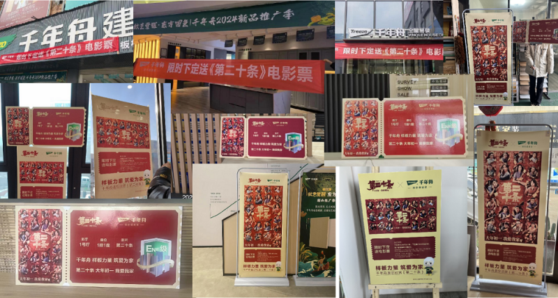 千年舟華北、華東、華南、華中、北部、中原、四川等七大戰區經銷商門店積極響應總部號召,開展新春開門紅活動,活動期間,線下門店“下定送影票”活動成功吸引大量消費者的注意力,七大戰區×20余城市送出電影票近200張,提升潛在客戶的好感,促進業務達成,并成功深度綁定電影,擴大品牌影響力。