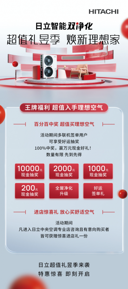 在315來臨之際,日立重磅推出“超值禮昱季 煥新理想家”鉅惠活動。優質產品、勁爆優惠、貼心服務應有盡有,真真切切給消費者一個放心選購的保障。2月24日—3月17日,正準備家裝煥新的朋友們,遇到日立這場鉅惠福利,趕緊進店參與活動吧。王炸新品、十倍膨脹金、10000元現金補貼、免費禮品直送...超多福利等你來薅!