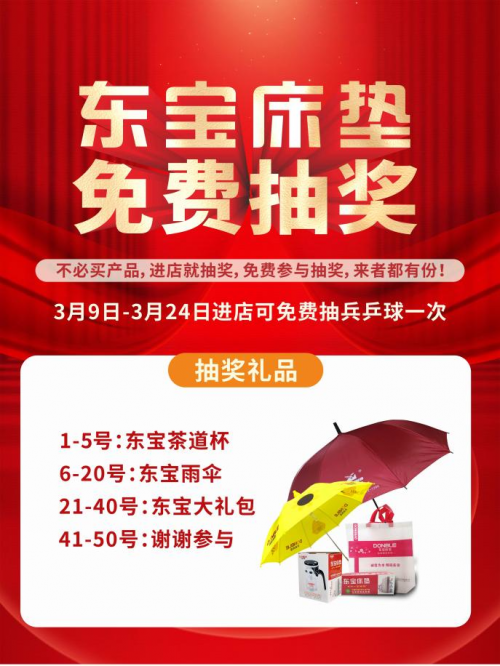 為感恩回饋廣大新老顧客一直以來(lái)對(duì)東寶床墊的支持與厚愛(ài),3月9日-3月24日,東寶床墊東莞專賣店舉行免費(fèi)抽獎(jiǎng)活動(dòng),不必買產(chǎn)品,進(jìn)店就可以免費(fèi)抽獎(jiǎng)!