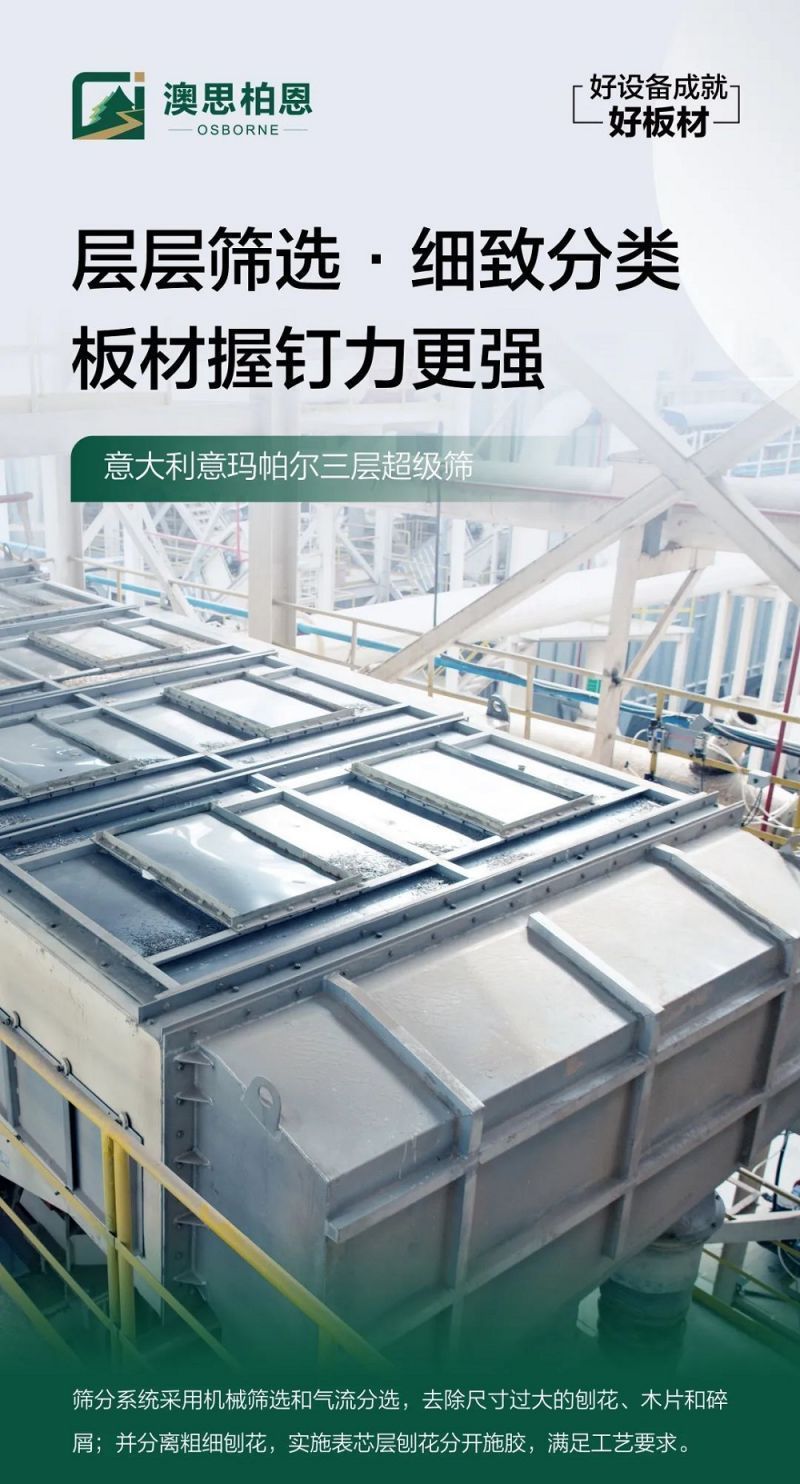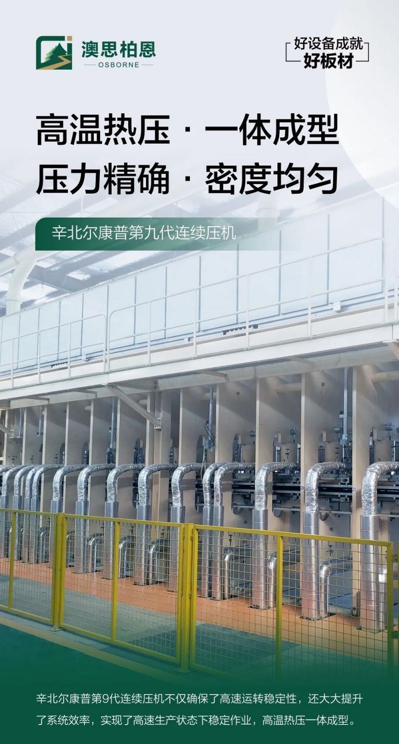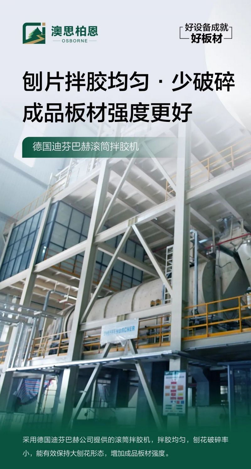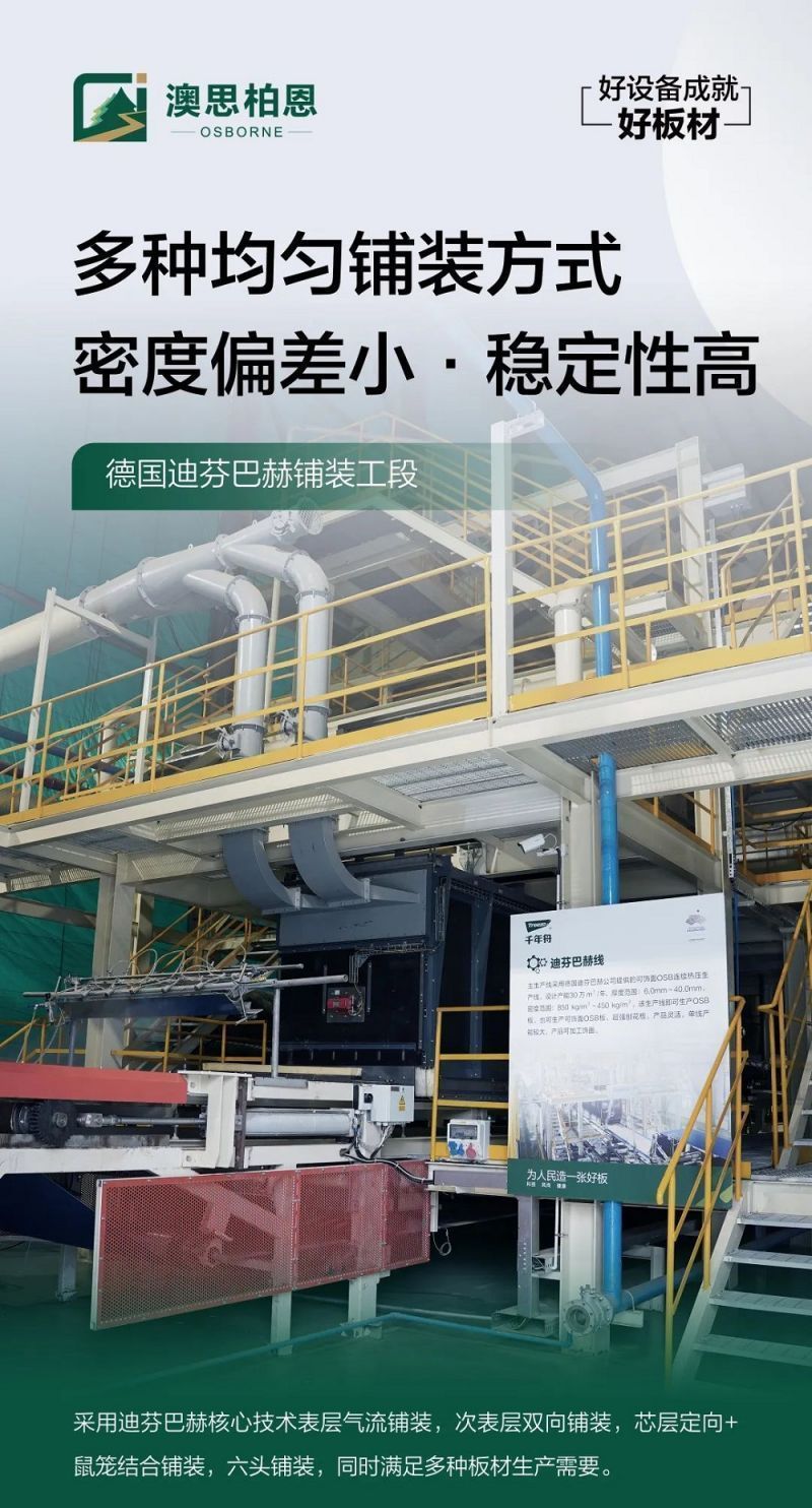 澳思柏恩采用德國進口迪芬巴赫鋪裝工段,具有鋪裝均勻、密度偏差小、漸變結構清晰、產品表面光滑細膩,靜曲強度及內膠合等重要指標波動小等優勢,確保板材的優合率。
