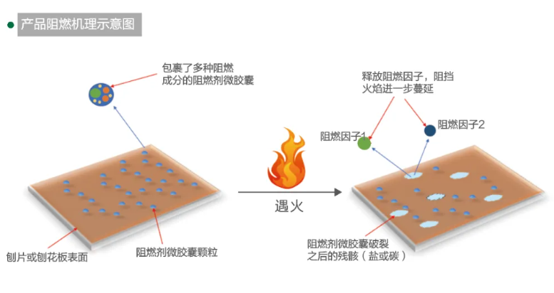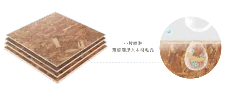 千年舟新型難燃OSB板,完美達到B1級難燃,具有優良阻燃性能,板材受熱時,刨片表面的微膠囊破裂,吸收熱量,同時釋放的高效阻燃因子能稀釋燃燒區域的可燃物濃度,有效抑制火焰蔓延。微膠囊破裂后,碳化、鹽化的產物覆蓋在刨片表面,阻止煙氣逸出,實現阻燃抑煙的雙重效果。