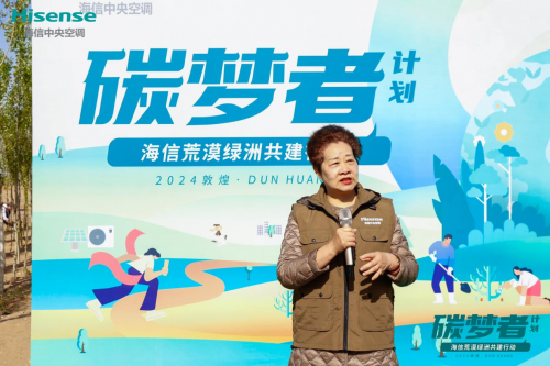 植樹現場,易媽媽分享了自己的公益故事。同時她表示,海信中央空調能夠連續三年來到敦煌,持續踐行綠色公益實屬難能可貴。她同時呼吁更多人傳承并發揚“億萬個人、億萬棵樹”的精神,一起助推綠色可持續發展。