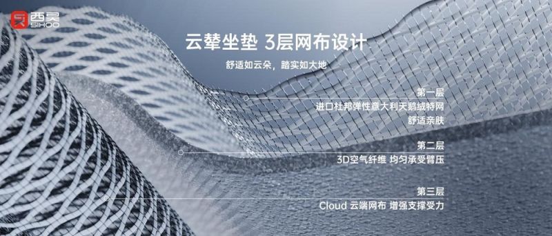 云輦空氣座墊采用三層復合網布結構設計,開創性地將3D空氣纖維技術應用于座椅座墊制造領域。首層選用源自意大利的高品質杜邦彈性體天鵝絨特制網布,以其細膩舒適的觸感和卓越的親膚性能保障用戶的第一層體驗。第二層核心技術在于3D空氣纖維材料的運用,其獨特的立體網格結構能夠均勻分散人體坐壓,極大地減輕久坐帶來的局部壓力。底層則是龍紋特網,增強了座墊的整體支撐性和承載能力。