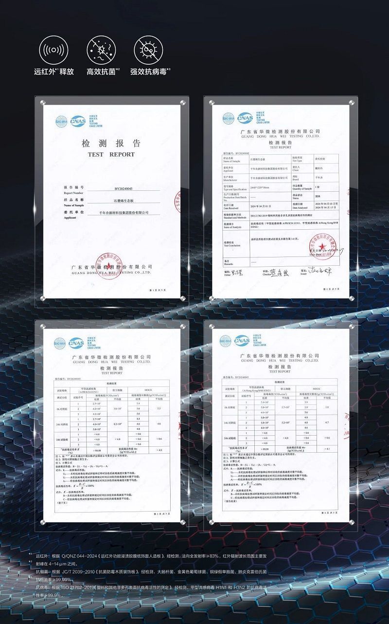 經第三方權威機構檢測,千年舟石墨烯生態板對大腸桿菌、金黃色葡萄球菌、銅綠假單胞菌、肺炎克雷伯氏菌抗細菌率≥99.99%;對甲型流感病毒H1N1和H3N2的抗病毒活性率≥99.9%,具有優良的抗菌、抗病毒功能,能夠有效守護全家人的四季健康。