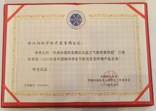 會議期間,中國制冷學會公布2023節能與生態環境產品和技術目錄,浙江陽帆節能開發有限公司旗下“快速除霜的變頻超低溫空氣能熱泵機組”憑借在節能方面的突出表現,獲得“中國制冷學會節能與生態環境產品”殊榮。這是陽帆在2024年斬獲的又一行業權威機構認證的榮譽,也是對陽帆產品品質的認可。