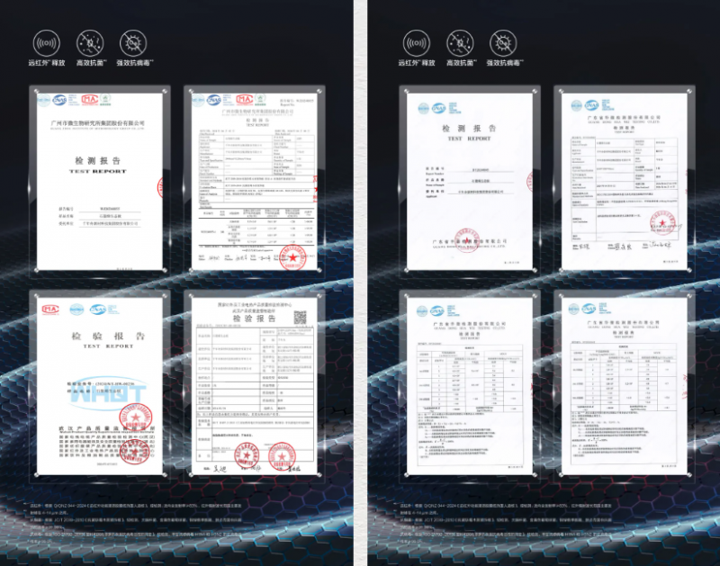 遠紅外:根據Q/QNZ 044-2024《遠紅外功能浸漬膠膜紙飾面人造板》,經檢測, 法向全發射率≥83%,紅外輻射波長范圍主要發射峰在4-14μm之間。