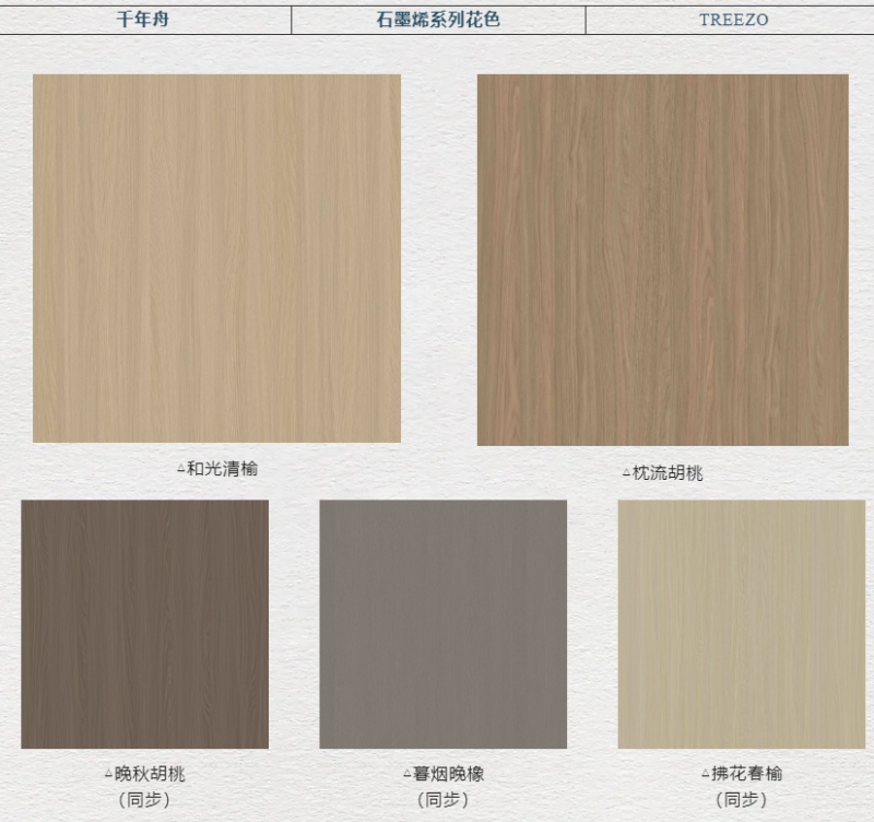 值得一提的是,除了功能上的突破,千年舟還推出了科技感和時尚感的——石墨烯智享花色。從淡雅清新的和光清榆,到優雅柔和的晚秋胡桃,再到質感夢幻的暮煙晚橡,每一種花色都是與眾不同,賦予居家滿滿的藝術氣息。