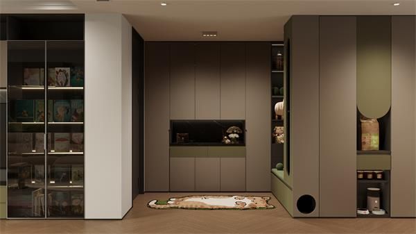 在整家布局中,“瓦爾登”系列充分發揮設計力,以貓咪太空艙、貓狗專屬喂食區、互動陽臺等特色功能區的設置,將寵物需求與人居動線結合,并不一昧地將人與寵物實現分隔,而是通過量身定制的實用分區,讓人寵互動能在更包容的空間中實現。