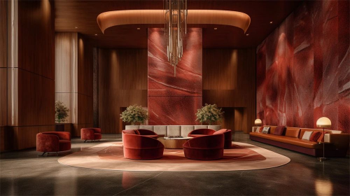 空間在材料語言與空間語法的組合上與大西美學商業思維與空間功能相契合,柔軟的酒紅色絲織品與深色石材的碰撞是品牌精神凝華為空間實體的精彩演繹。同時各樓層間又通過細節相互呼應,空間序列張弛有度,形成由美美學完整的空間形象體系。