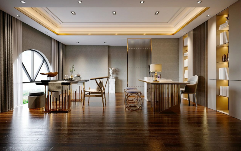 除了傳統(tǒng)的元素和色彩,中式設計還注重材質的選擇和運用。其中尤以實木地板與中式設計更為匹配,其材質具有自然、質樸的特點,能夠為室內空間增添一份自然美感。