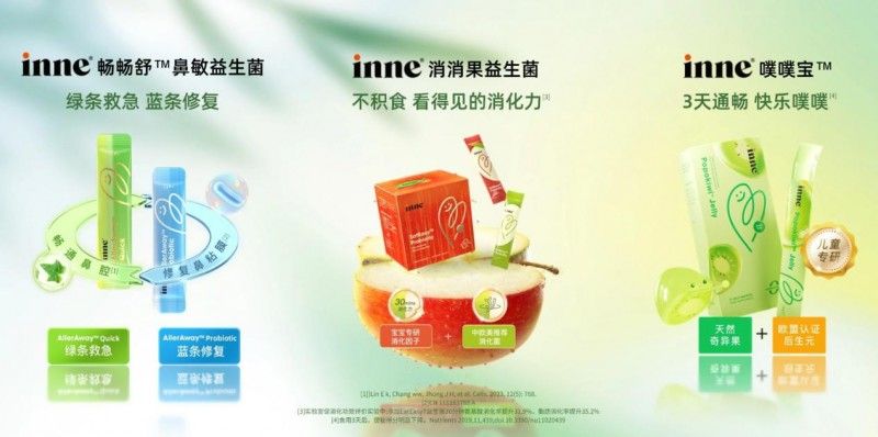 此次進博會,inne展品陣容十分強大,不僅帶來了消費者熟知的小金條鈣鎂鋅、竹節(jié)鈣、藍光盾、嬰幼兒DHA、全腦DHA等產(chǎn)品,新品inne益生菌·專研系列也在展會上首次與觀眾見面。這個系列針對兒童過敏性鼻炎和不同類型的腸胃問題專門研發(fā),包括緩解兒童過敏性鼻炎癥狀的inne鼻敏益生菌,以及緩解兒童積食和便秘兩大腸胃問題的inne消消果益生菌和inne噗噗寶益生菌,吸引了眾多消費者的目光。