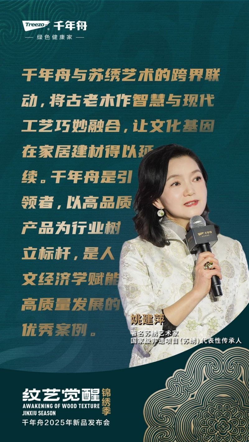 紋藝覺醒?錦繡季。2024年12月15日,千年舟2025年新品發布會于蘇州盛大啟幕。當天,著名蘇繡藝術家、國家級非遺項目(蘇繡)代表性傳承人姚建萍女士親臨現場,以蘇繡的傳承與創新為脈絡,帶來一場傳統非遺與現代創新深度交融的思想盛宴。