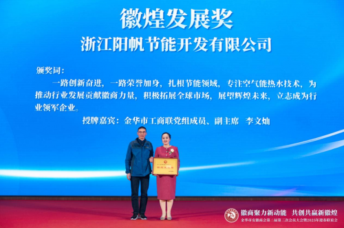 正如頒獎詞中所言,陽帆一路創新奮進,扎根節能領域,專注空氣能熱水技術,為推動行業發展貢獻徽商力量,積極拓展全球市場,展望輝煌未來,立志成為行業領軍企業?;赝^去,葉萍帶領陽帆人走出一條熱泵創業路,讓陽帆在熱泵行業獲得立足之地,也讓陽帆成為金華綠色經濟發展的示范企業。展望未來,陽帆仍將清潔能源領域持續深耕,用高品質產品服務用戶,為打造高能效節能社會作出貢獻。
