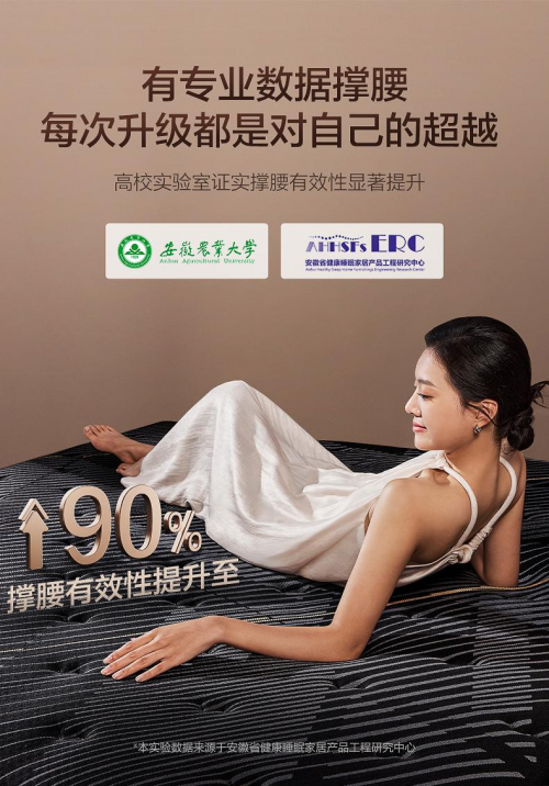 進(jìn)入 2025 年,顧家家居并未滿足于已有成績(jī),而是對(duì)撐腰床墊進(jìn)行了全面升級(jí),做到更撐腰,更沁爽。經(jīng)安徽農(nóng)業(yè)大學(xué)實(shí)證,其撐腰有效性達(dá)到 90%+,獲得專(zhuān)業(yè)認(rèn)證。升級(jí)后的床墊舒適度和耐用性進(jìn)一步提升,在延續(xù)經(jīng)典支撐性能的同時(shí),更加貼合人體工學(xué)設(shè)計(jì),為用戶帶來(lái)更極致的睡眠體驗(yàn)。