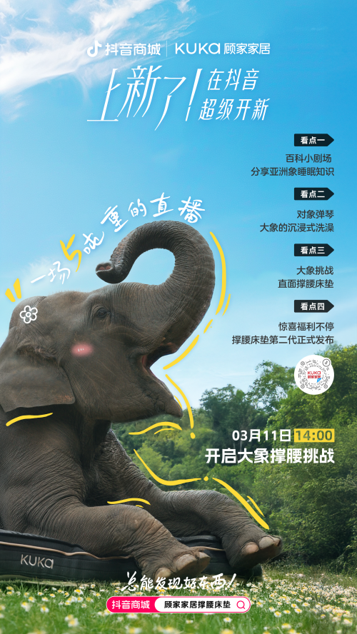 在近日的一場(chǎng)別開(kāi)生面的直播中,顧家家居以一場(chǎng)創(chuàng)意十足的活動(dòng)吸引了全網(wǎng)的目光。這場(chǎng)直播的主角之一是一位“重量級(jí)嘉賓”——大象,而另一主角則是顧家家居的撐腰床墊第二代。