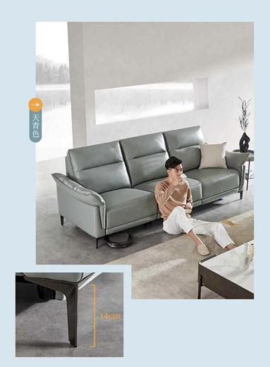 “云夢”系列的設計靈感源自中國傳統美學中“云卷云舒”的詩意想象。沙發以“天青色”為主色調,搭配14公分輕奢亮槍色金屬高腳,淡雅中透出低調奢華。設計師通過雙層捏邊工藝,塑造出如天鵝展翅般的飛翼扶手,線條靈動流暢,仿佛將云海翻涌的瞬間凝固于家居空間中。天然羽毛填充的扶手部分,不僅觸感柔軟透氣,更在視覺上營造出輕盈的懸浮感,呼應“云夢之上,樂享韶華”的主題。