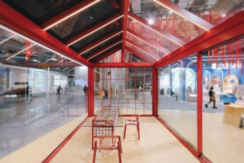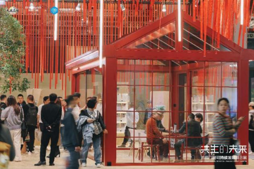 派雅門窗可持續發展概念展以可循環利用的模塊化骨架為基礎,通過通透的節能門窗系統串聯起“城市燈火”與“生態綠洲”。外立面的國雅紅幕墻象征萬家燈火的溫度,內場則通過全景推拉門、折疊門、落地窗等產品,消弭建筑與自然的邊界。