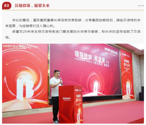 星際集團執行總裁邱文勝邱總進一步對“煥新破局·燃戰2025”的主題內核進行了底層邏輯和企業未來發展的延續,他表示,貝洛特系統門窗必須要堅定信念、專注目標、專注消費者,錨定“價值戰爭”,持續強化商業底層邏輯,以創新為核心驅動力,才能達到持續發展。
