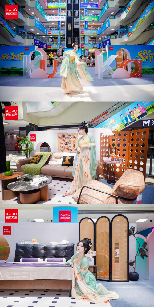 活動現場展出的顧家樂活中古風全屋新品LH.3007和LH.B1022PQ1,從客廳到臥室,打破材質與結構界限,融合牛皮、布藝、實木、新材料等多種材質,營造出復古與舒適交織的家,也吸引眾多消費者駐足、互動體驗。而現場更有漢服愛好者打卡,身著唐朝特色的服飾與妝容,讓中古風邂逅千年長安,營造出別有韻味的居家場景。