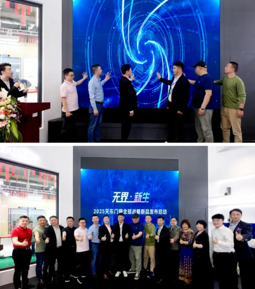 最后,發布會迎來高潮環節,袁志董事長攜手許順友、劉廣貴、張永志、王東旭、國肖龍五位嘉賓,共同按下“無界·新生光影啟動裝置”。隨著大屏呈現“邊界消融”的動態效果,主持人宣布:“2025天東門窗全球戰略新品正式啟航!”現場掌聲雷動,象征行業傳統壁壘被打破,開放共生的新生態正式開啟。
