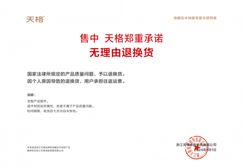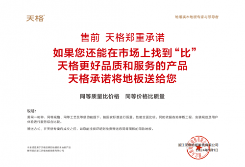 為進(jìn)一步保障用戶地板使用權(quán)益,天格地板還推出了五大承諾保障。其中包含售前質(zhì)量與價格的對比,售中無理由退換貨,售后的3年保修、25年品質(zhì)保證、十年免費翻新打磨、終身免費拆裝一次。值得一提的是,3年保修這一條,不僅彰顯了天格對產(chǎn)品質(zhì)量的自信,更以其超越行業(yè)標(biāo)準(zhǔn)的保修期,樹立了地板行業(yè)售后服務(wù)的最高典范。