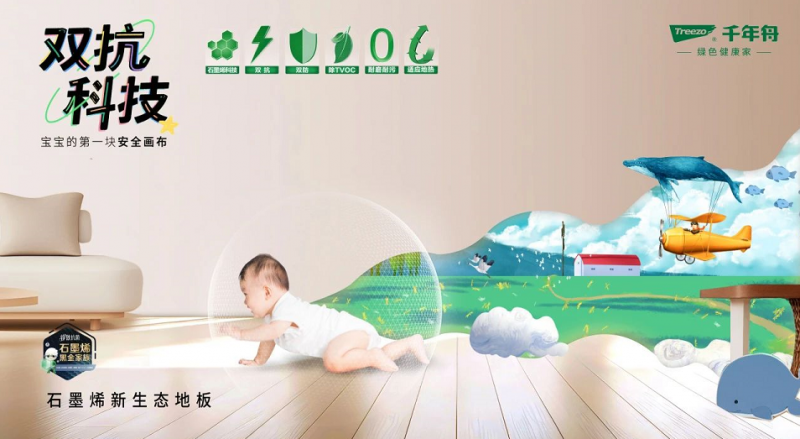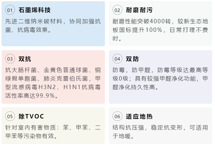 石墨烯新生態地板創新融合高科技石墨烯材料與鋅效抗菌技術,通過石墨烯表面活性基團催化環境中的水氧分子生成強效活性氧,加強殺滅細菌和病毒效果。產品集成六維防護(石墨烯、雙防‘0級防霉,防甲醛’、雙抗‘99.9%抗菌,99.9%抗病毒’、除TVOC、耐磨耐污、地熱適配),ENF級環保基材杜絕甲醛隱患,耐磨性較常規新生態地板提升100%,穩定性強抗變形,精準服務高端住宅、母嬰及養寵家庭,以“健康科技+性能突破”定義高端市場標桿。
