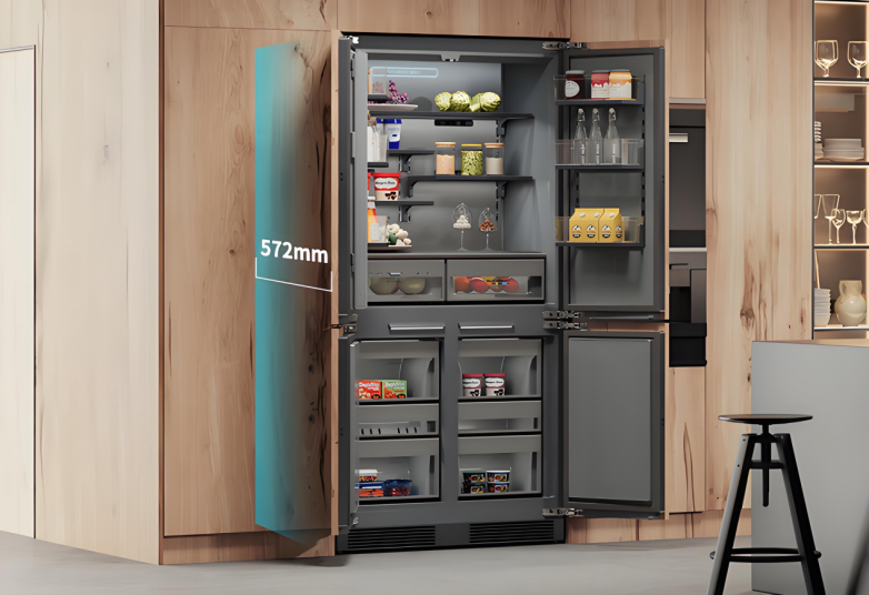 眾所周知,傳統(tǒng)嵌入式冰箱因機身厚度不一,往往需要用戶根據(jù)機身實際厚度去額外定制非標櫥柜,進而導致裝修成本升高、周期延長。GRF反其道而行,以600mm標準櫥柜尺寸倒逼冰箱工業(yè)設計,通過結(jié)構(gòu)優(yōu)化將冰箱機身厚度進行了壓縮,實現(xiàn)Overlay全嵌系列冰箱機身厚度572mm、零平嵌系列冰箱機身厚度598mm,高度適配600mm標準櫥柜。