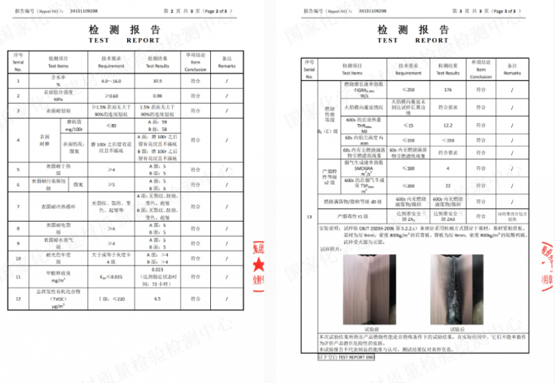 千年舟抗彎海洋生態板生產過程中使用無機膠黏劑,本身不燃且耐受高溫,成品板經第三方檢測后,燃燒性能達B1級難燃,離火不燃燒;而且抗彎海洋生態板被燒灼后少煙、低毒,600s總煙氣生成結果22,遠低于國標≤200的要求,全方位呵護你和家人的安全!