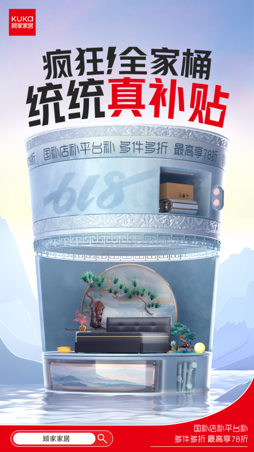 一方面,顧家家居在京東、天貓、抖音等核心電商平臺開設618專屬會場,核心策略圍繞國補疊加,將國家補貼、品牌讓利與平臺優(yōu)惠進行深度整合。通過突出多件多折、爆款直降等核心利益點,顯著降低消費者換新門檻,讓消費者真切感受到“換得起”、“換得實惠”。