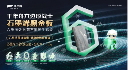 千年舟石墨烯黑金板,首次將石墨烯應用于家居板材,結合鋅效抗菌技術,形成抗菌、抗病毒、防霉、凈醛、除TVOC、石墨烯等六大核心功能,堪稱家居健康的“全能護衛”,以六維健康科技,重新定義家居防護新標準,向梅雨季節的隱形威脅說“NO”!