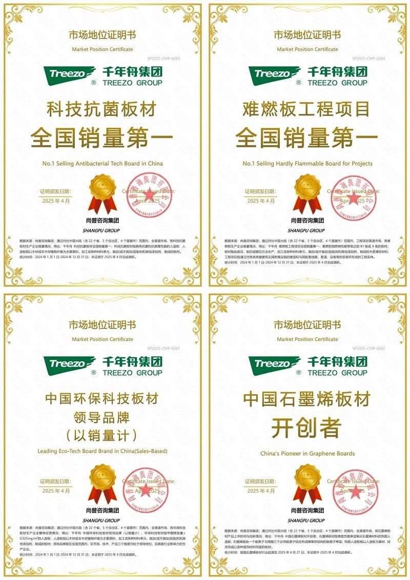 2025年4月,千年舟獲得“中國石墨烯板材開創(chuàng)者”、“科技抗菌板材全國銷量第一”、“難燃板工程項目全國銷量第一”、“中國環(huán)保科技板材領(lǐng)導(dǎo)品牌(以銷量計)”等四大市場地位認(rèn)證(數(shù)據(jù)來源尚普咨詢集團(tuán)),黑金科技,引領(lǐng)趨勢的品質(zhì)標(biāo)桿。